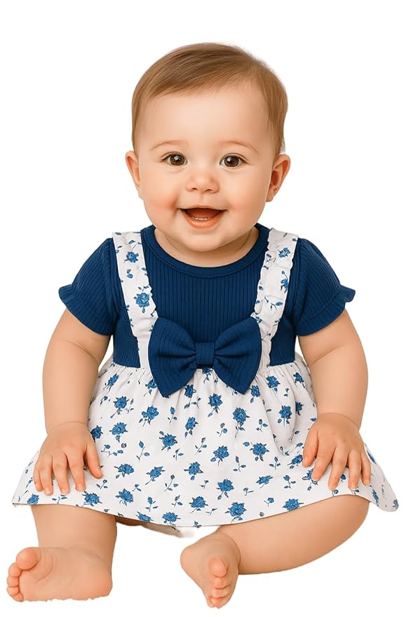 - 🌼 Elegant Floral Charm – Adorable white suspender skirt with blue rose print and ruffled straps, paired with a stylish navy ribbed top for a classy baby look.