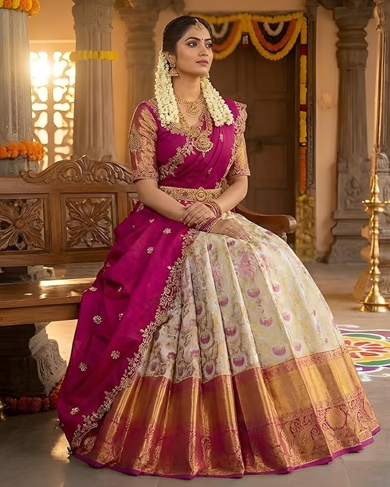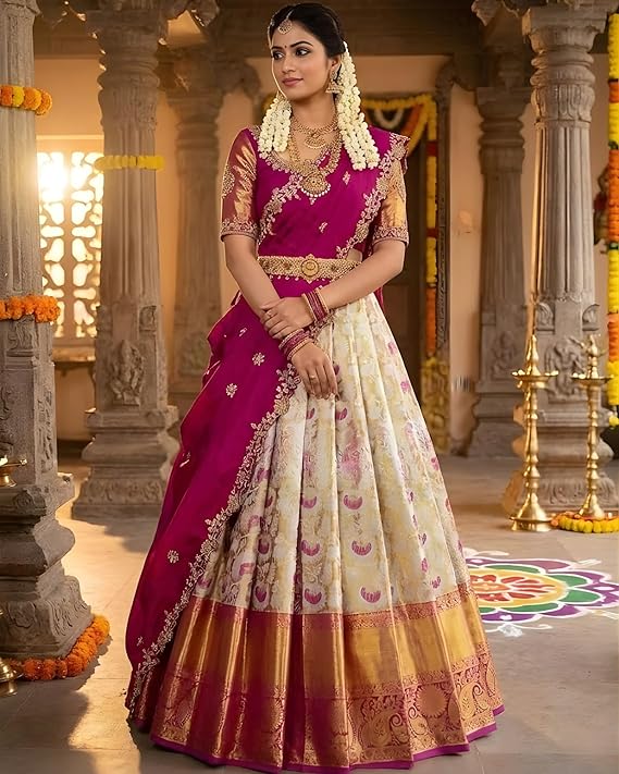 - Premium Jacquard Fabric: Crafted from high-quality jacquard fabric, this silk half saree offers a royal look, soft feel and graceful fall, ideal for weddings and festive wear.